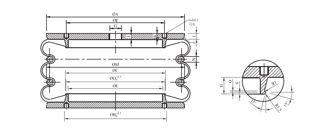 自封式,是因其無需外力自行密封而得名。如圖,用纖維層做補(bǔ)強(qiáng)處理的橡膠曲囊①在使用時(shí),將防止膨脹的鋼制(鍍鋅)腰環(huán)②嵌在其中。③蓋板的端部鋼絲圈借助空氣內(nèi)壓的作用,使橡膠口部發(fā)生變形與上下蓋板(鍍鋅)④密切接觸,從而可防止空氣泄漏。上下蓋板④通過機(jī)械加工成型。⑤是用于安裝進(jìn)氣管路的管螺紋進(jìn)氣孔,⑥則是安裝用的標(biāo)準(zhǔn)螺紋孔。